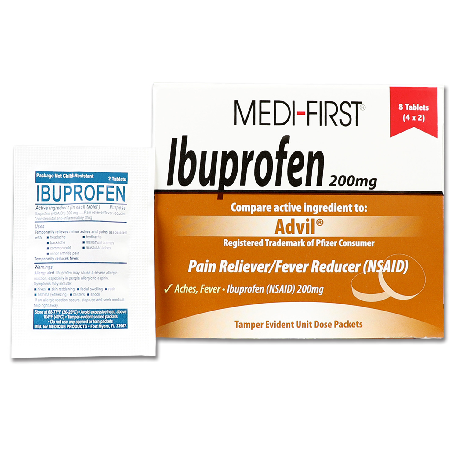 Ibuprofen, 8 tablets per box, 4 packets of 2 tabs each