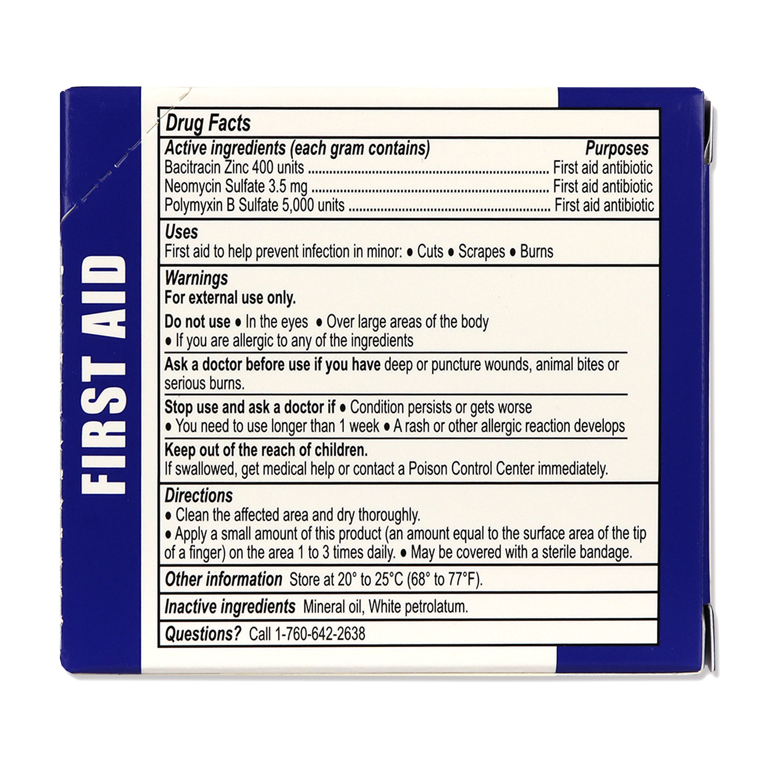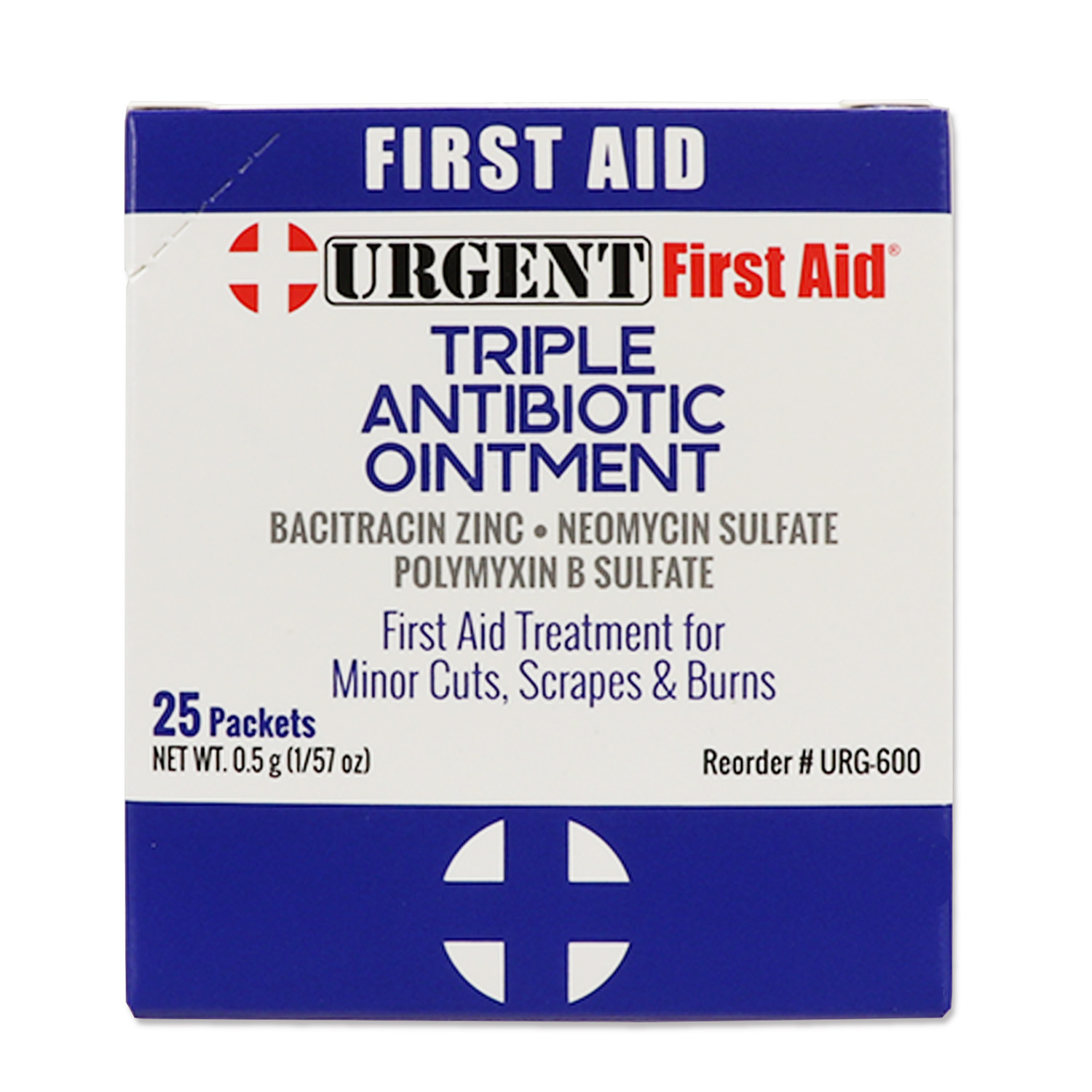 Triple Antibiotic Ointment (Contains Bacitracin Zinc, Neomycin Sulfate and Polymyxin-B Sulfate) Convenient single-use packaging in 25 count dispenser box is easy to use for fast application and instant relief. Simply apply on minor cuts, burns and scrapes. Active ingredients Bacitracin Zinc 400 units Neomycin sulfate 3.5 mg Polymyxin B sulfate 5000 units Purpose Antibiotic Uses First aid to help prevent infection in Minor Cuts, Scrapes & Burns Warnings For external use only Ask a doctor before use if you have: Deep puncture wounds, animal bites or serious burns Stop use and ask a doctor if: Irritation and redness develop and/or condition persists for more than 72 hours Keep out of reach of children If swallowed, get medical help or contact a Poison Control Center right away. 1-800-222-1222 Directions Clean the affected area. Apply a small amount of this product (an amount equal to the surface area of the tip of a finger on the area 1 to 3 times daily. May be covered with sterile bandage. This item meets ANSI/ISEA Z308.1 standards for first aid refill items. ANSI Information